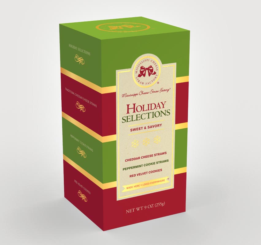 A NEW tower carton elegantly embellished with gold foil and embossing! Filled with 3 oz. each of Traditional Cheddar Cheese Straws, NEW Peppermint Cookie Straws, and NEW Red Velvet Cookies individually packed within.